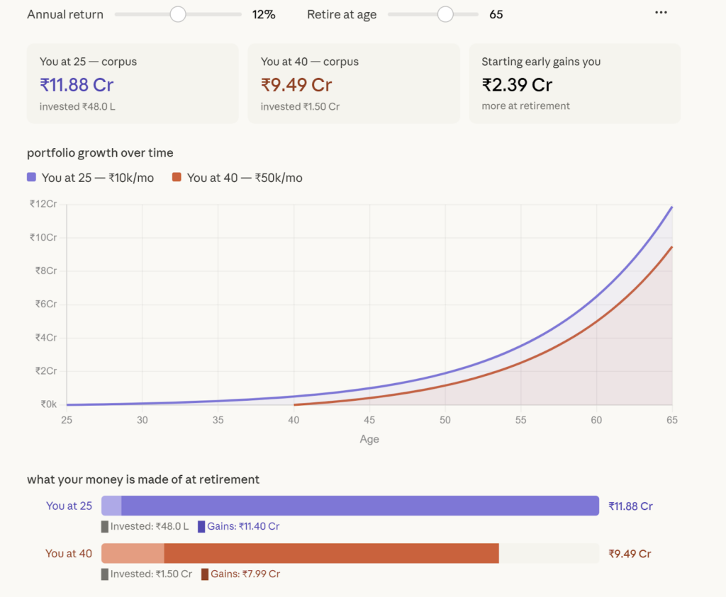At the default 12% return retiring at 65, you investing ₹10k/month from age 25) builds ~₹11.7 Crore while you investing (₹50k/month from age 40) builds ~₹9.4 Crore, despite putting in 5x the monthly amount and investing over ₹1 Crore more in total.