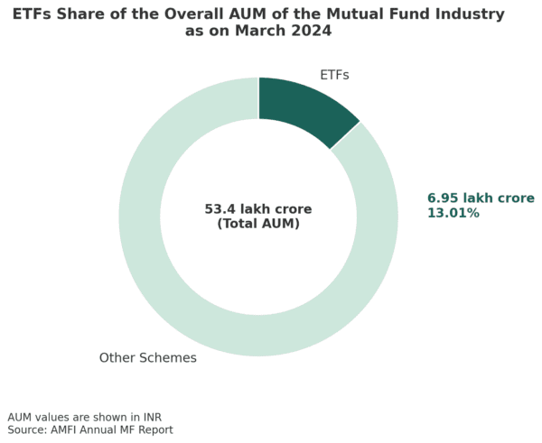 On an annual report released by AMFI on march 2024, said that ETFs constitute close to 13% of the overall mutual fund industry AUM. [1] ETFs occupy a share of ₹6.95 lakh crore out of ₹53.40 lakh crore of the total AUM of the mutual fund industry.